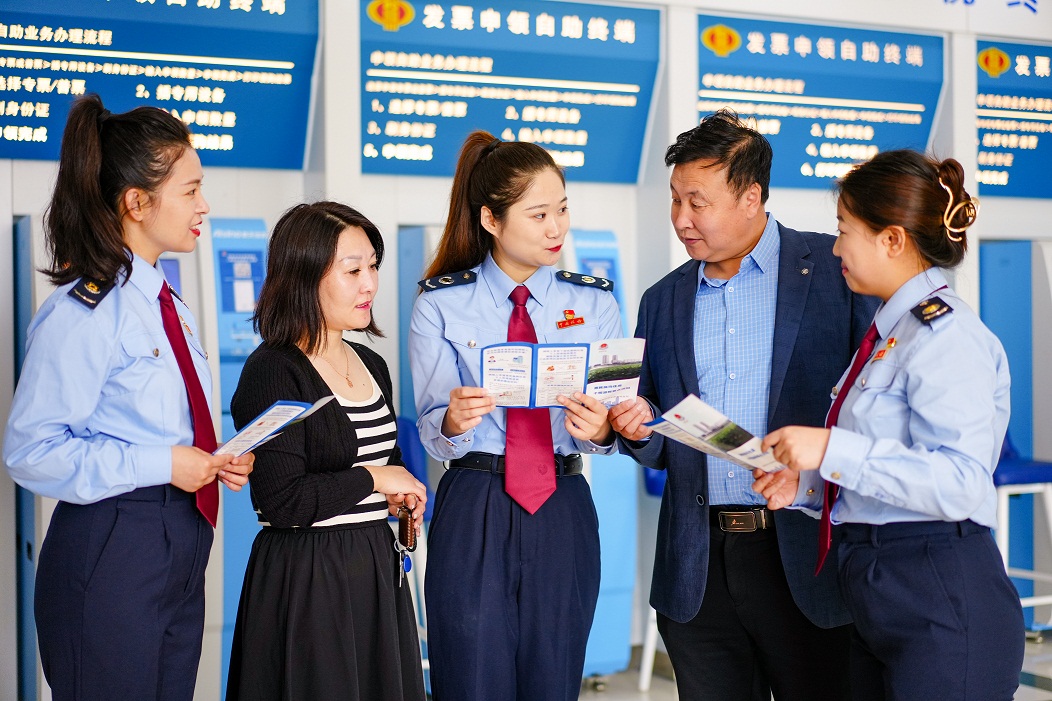 图为阜新蒙古族自治县税务局“娜仁花”志愿服务队为纳税人、缴费人讲解税费政策。(徐鹏云摄)