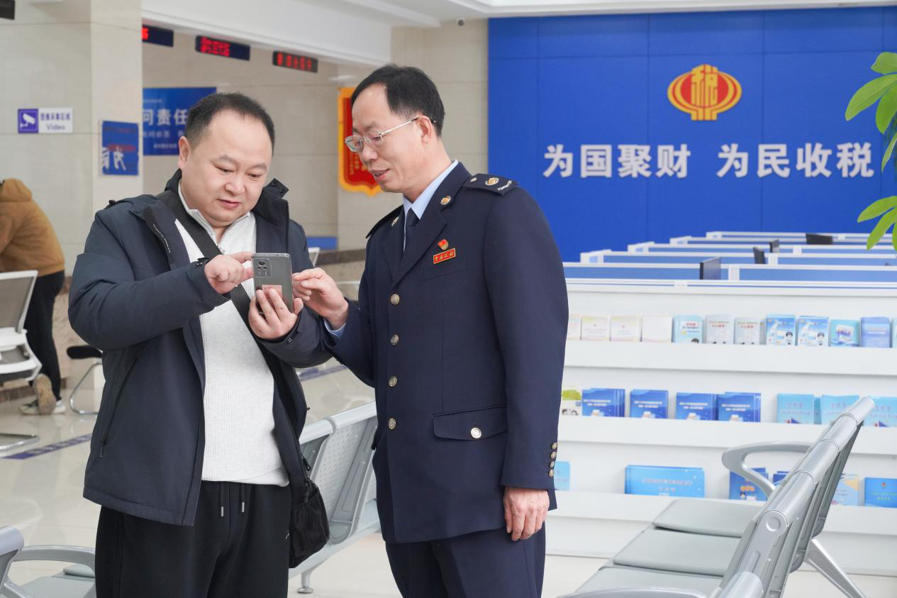 国家税务总局抚顺市税务局大力弘扬雷锋精神,组建学雷锋志愿服务队,搭载“雷锋号”移动办税服务车走企业、进乡村,宣传辅导税费政策、设立咨询站、开展税务讲堂,为群众解难题、办实事,让雷锋精神在税费服务一线持续生辉。图为雷锋战友、抚顺市望花区税务局建设税务所所长韦坤(右)在辅导纳税人利用手机办税缴费。